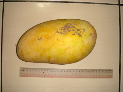 Now here is a giant mango. When I first saw it I was so surprise at the size. Then I told R to put it on a scale. It weight more than 2 kilogram ( 4 lbs ) each! I am even more surprise when my mother in law peel it and she showed me how thin is it's seed. No more than 1.5 cm.